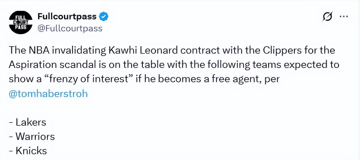 北京时间2月24日,据NBA记者汤姆-哈伯斯特罗报道,因此前涉及的阴阳合同问题,NBA有可能会宣布莱昂纳德与快船的合同无效。一旦莱昂纳德成为自由球员,预计湖人、勇士、尼克斯等球队会疯狂追求他。哈伯斯特罗在节目上的报道如下——